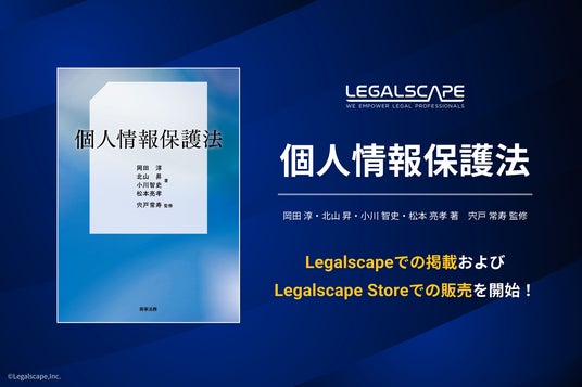 株式会社Legalscape(本社:東京都文京区 代表取締役社長・最高経営責任者:八木田 樹、以下リーガルスケープ)は、商事法務の『個人情報保護法』(著:岡田 淳・北山 昇・小川 智史・松本 亮孝 監修:宍戸 常寿)の掲載を開始したことをお知らせします。また、デジタル版法律書籍のECサイト「Legalscape Store(リーガルスケープストア)」での取り扱いも開始いたしました。