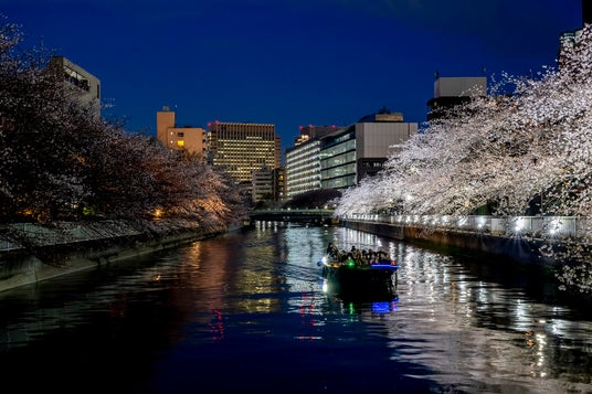 東京駅付近の高層ビルを借景に美しく浮かび上がる大横川の夜桜