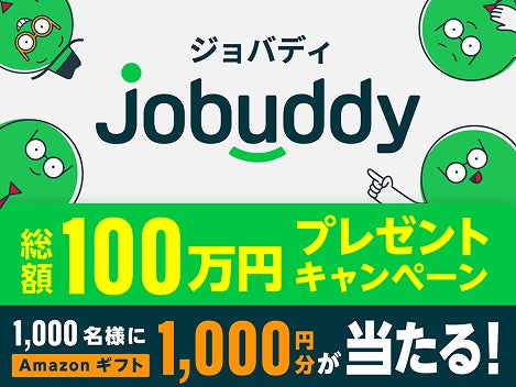 Jobuddy公式Xアカウントをフォロー後、公式アカウントがポストしている「#ジョバディ、もうチェックした??」という キャンペーン投稿をリポストした方の中から、抽選で1,000名様にAmazonギフト1,000円分をプレゼント。