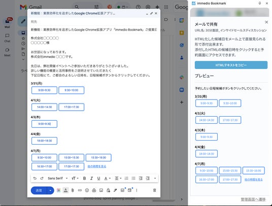お問い合わせや資料請求から商談や面談率を最大化させるためのオンラインサービスを提供している株式会社immedio(本社:東京都港区、代表取締役:浜田 英揮、以下 immedio)は、提供するインバウンド商談SaaS「immedio(イメディオ)」の新機能として簡単に日程調整URLのリンクと候補日程が取得できるGoogle Chrome拡張アプリ「immedio Bookmark」の提供を開始しました。