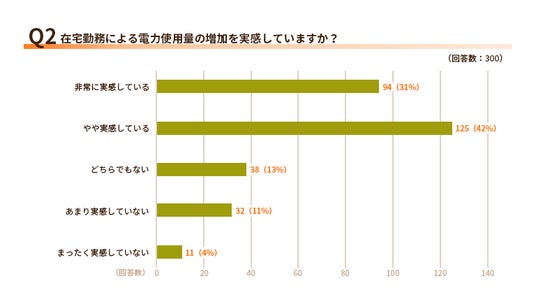 これに対し、「あまり実感していない」または「まったく実感していない」と答えた割合は全体の15%に留まりました。在宅勤務により、家庭での照明や冷暖房、パソコン、家電などの使用時間が増加します。特に、平日の昼間の電力使用量が以前より増えている可能性が高いでしょう。