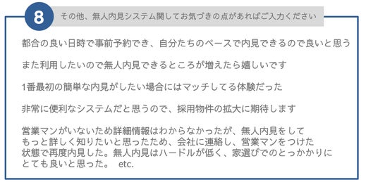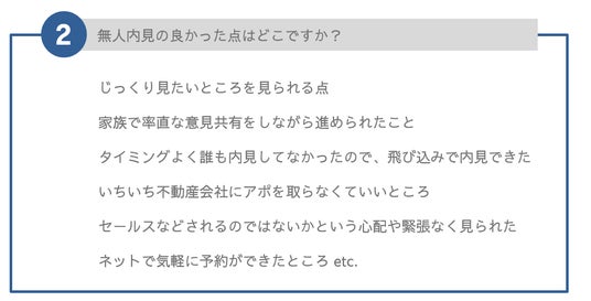 なぜ無人内見を利用しようと思ったのかを尋ねた質問(自由回答)では、「スタッフに気を使わないで、ゆっくりと見たい」「自分たちのペースでリラックスして内見できる」「気楽だった」というように、内見時に同伴するスタッフを煩わしく思っているケースや、気兼ねなく内見を行いたいというユーザーの心理が伺えます。また、「急に内覧に行く」「思い立ったらすぐに内見できる」「夜間でも内見できる」など、自由な時間に内見を行いたいというニーズが高いこともわかります。