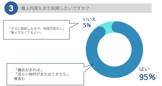 「無人内見をまた利用したいですか?」を聞いた質問では、95%が「再び利用したい」と回答しました。「いいえ」を回答したユーザーのなかには「すでに契約したので、利用予定なし」といった回答もありました。