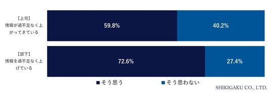 すると上司側は、報告が過不足なく上がってきているに「そう思う」と回答したのは59.8%だったのに対し、部下側は、報告を過不足なく上げているに「そう思う」と回答したのは72.6%でした。