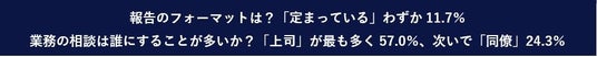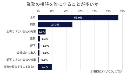 続いて業務の“相談”について、誰に相談することが多いのかを聞くと、「上司」が最も多く57.0%で、次いで「同僚」24.3%という結果でした。