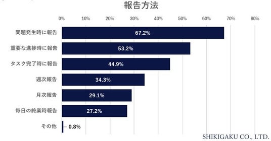 次にその報告方法について聞いてみると、「問題発生時に報告」が最も多く67.2%で、次いで「重要な進捗時に報告」53.2%、「タスク完了時に報告」44.9%と、タスク毎による局面での報告が上位を占めました。