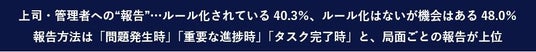 一方で「週次報告」は34.3%、「月次報告」は29.1%、「毎日の終業時報告」は27.2%と、月及び日ごとの“定期的な報告”は3割程度という結果でした。