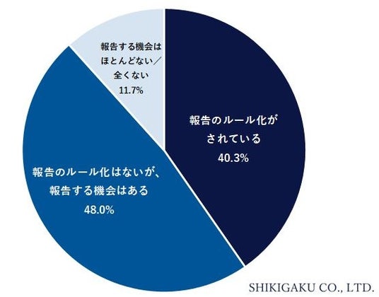 上司もしくは管理者がいる20代から50代の会社員の方に、“報告する機会”についてお聞きしました。「報告するルール化はされていないが、報告する機会はある」が最も多く48.0%で、次いで「報告することがルール化されている」40.3%と9割近くの方が“報告する機会”があるという結果でした。