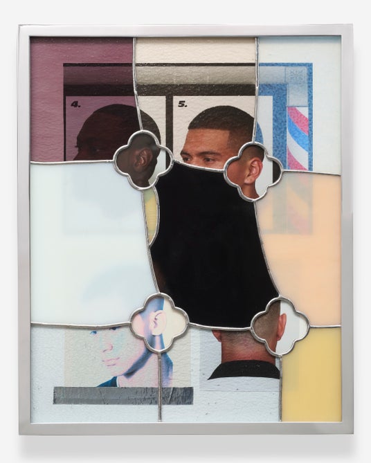 Fin Simonetti, Chapel 11, Stained glass, collage of barbershop posters, aluminum tape, 42.545×34.925cm, 2023