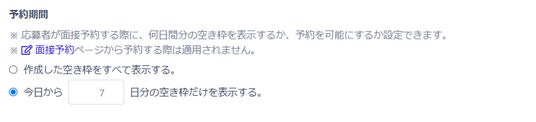 これまでは応募者画面に先の予約枠を制限なく表示され予約も可能な仕様でしたが、今回の機能追加で任意の期間の空き枠のみ表示させることが可能になりました。直近の空き枠のみを表示させることで応募者に数カ月先の予約を入れられてしまうという事態を防止出来ます。