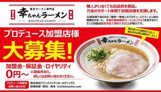 本場博多豚骨ラーメンを全国展開している「幸ちゃんラーメン」の加盟店様大募集!期間限定キャンペーン!今ならなんと「加盟金0円!」の出店プランをご用意しています!