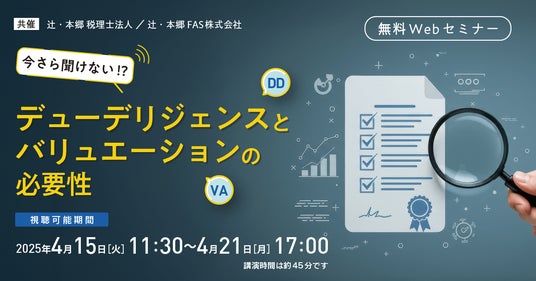 辻・本郷 税理士法人(本社:東京都新宿区、理事長:桑木小恵子)は、辻・本郷 FAS株式会社(本社:東京都中央区、代表取締役社長:山田翔吾)と共催で、2025年4月15日(火)より「今さら聞けない!? デューデリジェンスとバリュエーションの必要性」セミナーを開催いたします。