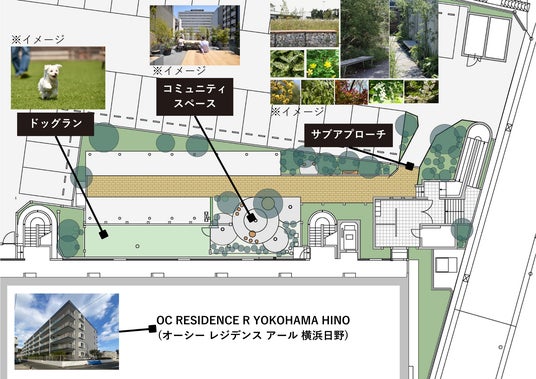2025年2月に竣工する「OC RESIDENCE R YOKOHAMA HINO(オーシー レジデンス アール 横浜日野)」においては、「緑と生物がつなぐ安心安全な住まい」をコンセプトにリノベーション。共用部の大規模改修により外観を一新し、外構の空地部分には四季を感じられる花木を新植。住民同士のコミュニケーションを誘発するコミュニティスペースを新設しました。地域に生息する鳥や蝶などの生物を呼び込む植物を設置することで、生物多様性に配慮し、子どもたちが生物とふれあう体験を誘発。ドッグランを併設し、ペットフレンドリー賃貸住宅へとバリューアップします。