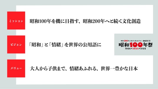 「昭和」の奇跡を未来へと継承したい。昭和を一過性のブームに終わらせることなく、昭和200年まで継承していくことを目指します。昭和にあふれていた元気や夢は、ノスタルジーでなく温故知新こそが大切だと掲げてます。