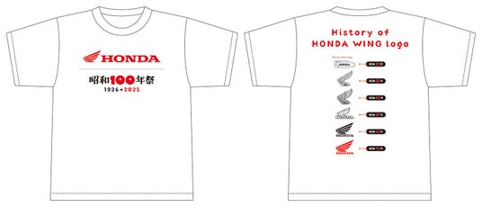 「History of HONDA WING Logo Tシャツ」は、本田宗一郎の夢を乗せたファースト・デザインを含む6つのマークを、ホンダの歴史上初の昭和表記で配しました。グローバルにビジネスを展開するホンダが、昭和100年を記念した奇跡といえます。