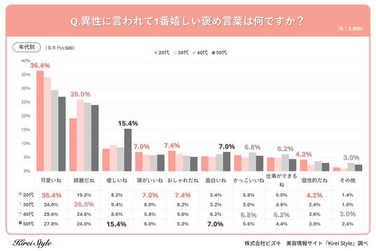全国の20代~50代の女性2,000人を対象に、「異性に言われて1番嬉しい褒め言葉は何ですか?」というアンケートを実施したところ、最も多かった回答は「可愛いね」で31.7%となりました。次いで、「綺麗だね」が23.5%、「優しいね」が23.5%と続く結果となりました。また、「その他」として、「若いね」、「話しかけやすいね」などの回答が得られました。