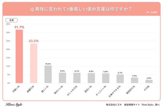 異性から言われて1番嬉しい褒め言葉は?第2位は「綺麗だね」で23.5%、第1位は?