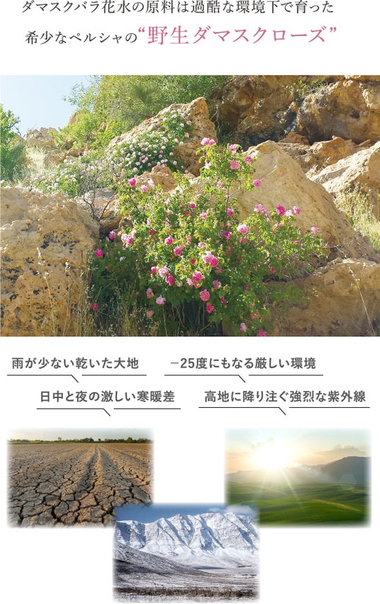 ペルシャの野生ダマスクローズは、過酷な自然環境の中でも、みずみずしい花を咲かせます。