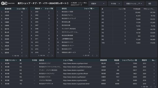 2019年から2024年の楽天ショップ・オブ・ザ・イヤー受賞ショップをジャンルや受賞年、各項目をクリックし、いろいろな条件で表示・分析することができます。