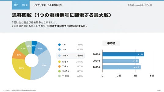 ISの架電件数は平均34件/日、リードに対する追客回数は平均5.1回。 ともに調査以来、過去最高を更新。