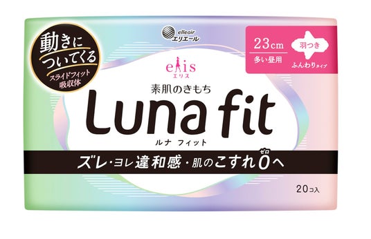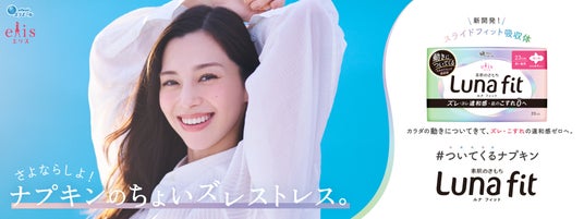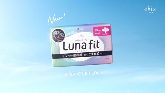 「エリス 素肌のきもち ルナフィット」は、体の動きについてくる“スライドフィット吸収体”を採用した、独自開発の生理用ナプキンです。ナプキン内部に空間層をつくることで、吸収体が自在にスライド。ナプキンが体の動きについてくるため、肌とのスキマができにくく、ナプキンのズレ・ヨレを軽減し、経血もしっかりキャッチする仕様になっています。