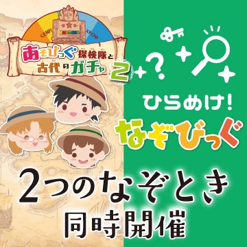 第4弾の謎解きエンターテインメントは、幅広い年齢のお子さまが気軽にお楽しみいただけるよう、小学生向けの『あそびっぐ探検隊と古代のガチャ2』と3歳~5歳向けの『ひらめけ!なぞびっぐ!』の2つの謎解きを同時開催します。