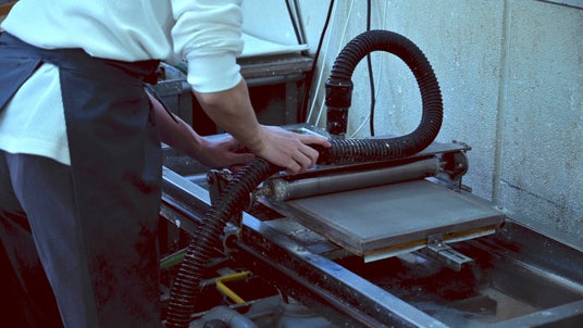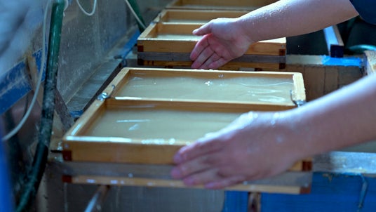 障がいのある方々が、廃材を一枚ずつ丁寧に漉き込む。