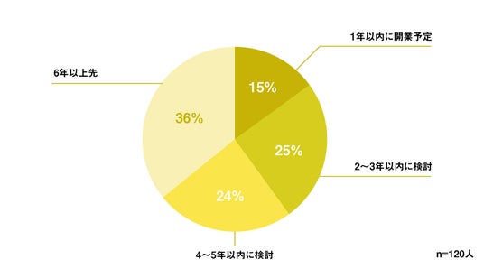 - 最も多い 35%(43名)が「6年以上先」と回答