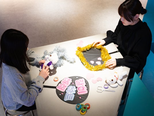 コワーキングやリラックスはもちろん、大きなテーブルでは レンタル文具を使ってライブで使用するうちわやオリジナルアイテムを手作りすることも可能です。