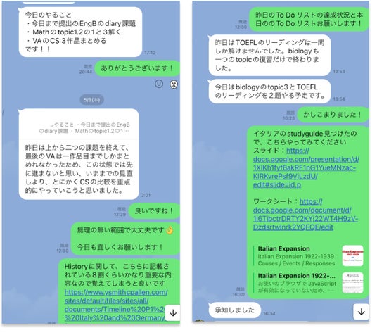 当塾では、定期的な進捗報告を実施し、生徒の学習状況を可視化。チャットで毎日の進捗管理を行うことで、計画通りの学習を徹底。さらに、IB卒業生が24時間対応し、授業外でも質問や相談に応じるため、疑問を即時解決できます。継続的なフィードバックと戦略的な調整を通じて、最短最速で成績向上を実現し、目標達成を確実にサポートします。