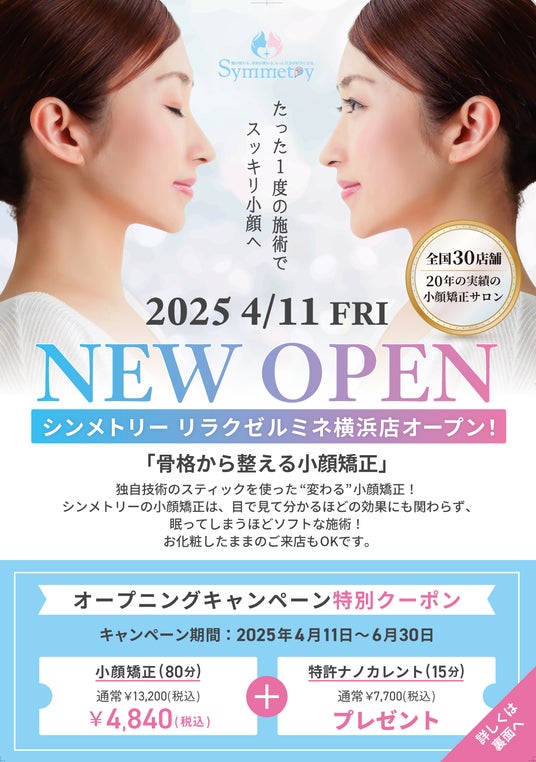 シンメトリー リラクゼルミネ横浜店のオープンを記念して、小顔矯正(通常13,200円)と特許波形ナノカレント施術(通常7,700円)の合計20,900円が期間限定で税込4,840円にて体験できる特別キャンペーンを2025年4月11日~6月30日まで実施いたします。