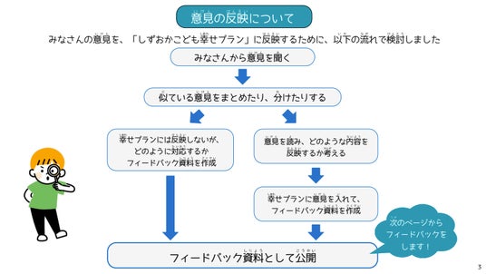 プラン策定にあたって、こども・若者から集まった意見についてはフィードバック資料を作成し、こども・若者へのフィードバックも実施しています。また、フィードバックに対しての意見聴取も行うことで、双方向のやりとりを意識してきました。