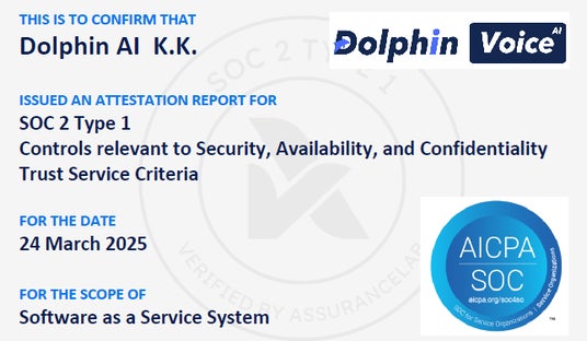 DolphinVoice音声AIサービス -【SOC2 Type1】報告書取得&内部統制評価した国際基準のセキュリティ達成