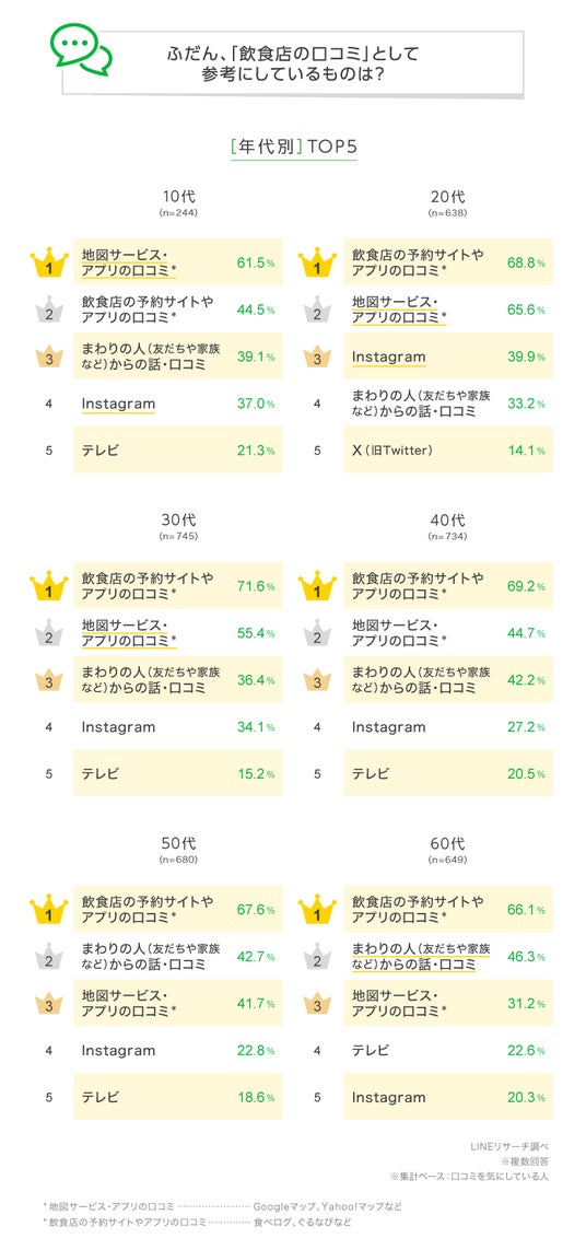 【LINEリサーチ】「飲食店の口コミ」を気にする人は約7割!参考にする情報源は年代によって違いがみられる