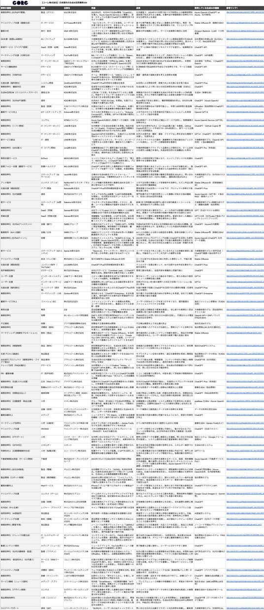 AIコネクティブカンパニーのコーレ株式会社(本社:東京都新宿区、代表取締役:奥脇 真人、以下コーレ)は、「生成AIで具体的に何ができるのか?」という企業の疑問に答える参考資料として、日本国内においてWeb上で公開されている生成AI活用事例359件を調査し、リスト化しました。