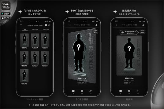 今回提供するEXILE TRIBE所属アーティストのLIVE CARDをご利用いただくには、専用コレクションアプリ「YOIN for EXILE TRIBE」のダウンロードが必要となります。アプリではLIVE CARDを360°自由に動かしたり、アニメーションや音声を再生したりと、デジタル技術を活用したコンテンツを体験できます。また、LIVE CARDごとに公演日や会場名をはじめとしたライブ情報・アーティスト情報の閲覧や、ご購入者様限定特典もご利用いただけます。従来のライブグッズとあわせて、デジタルならではの魅力が溢れる「LIVE CARD」をお楽しみください。