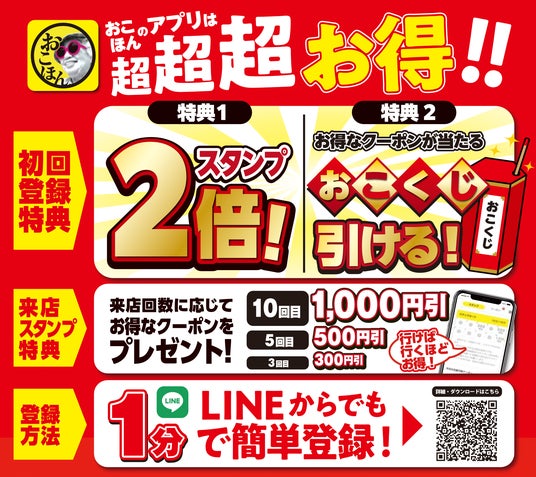 株式会社物語コーポレーション(本社:愛知県豊橋市/代表取締役社長:加藤 央之)は、全国20店舗展開中の『お好み焼本舗』(以下、おこほん)は、2025年2月25日(火)より、抽選で100名様に500円分のアプリクーポンが当たる、Xフォロー&リポストキャンペーンを開催いたします。