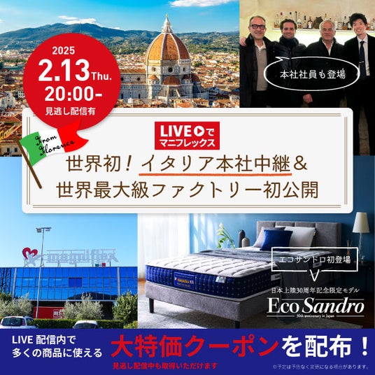 イタリアの総合寝具ブランド「マニフレックス」(輸入元:株式会社フラグスポート、代表取締役社長:山根崇裕、東京都港区)は、人気コンテンツ『Liveでマニフレックス』の一環として、日本とイタリア本社を繋ぐスペシャルライブ配信企画「世界初!イタリア本社中継&ファクトリー初公開」を2025年2月13日に実施し、さらに10日間にわたる見逃し配信でのキャンペーンも終了いたしました。