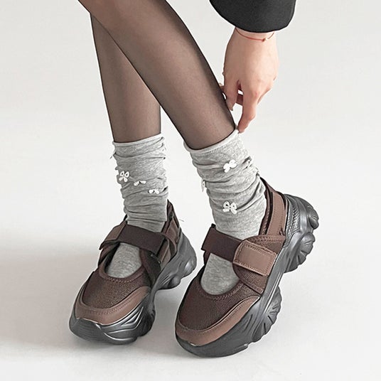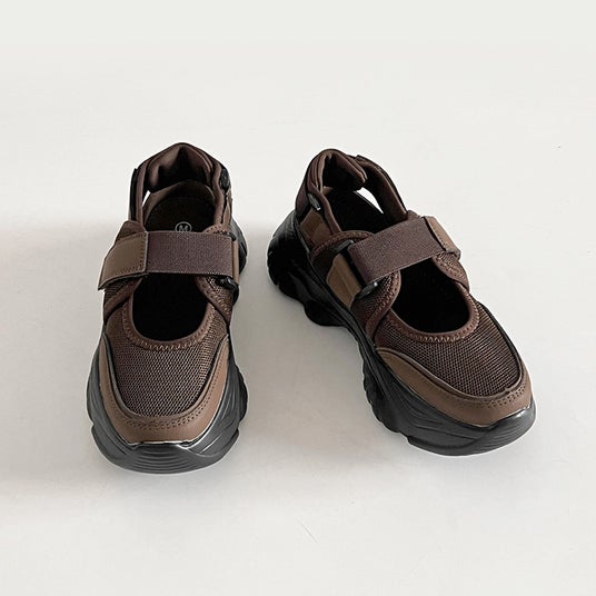 春夏に最適!つま先を覆うクローズトップ×かかとオープンのサンダルスニーカー「軽量厚底 ボリュームソール ベルクロストラップ サンダルライク スニーカー 2419」に新色の大人見えダークブラウンが登場。
