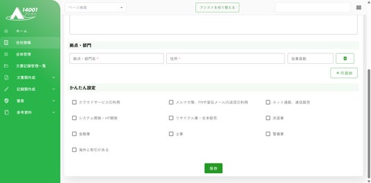 『14001アシスト』は、ISO14001新規取得や運用に必要な書類作成・スケジュール管理等を、クラウド上でスマートに運用できるツールです。