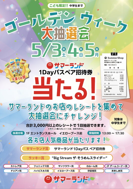 ■抽選方法 期間中、サマーランドの飲食・物販店舗全店で、当日お買上げレシートの合計金額3,000円(税込)で1回抽選できます。