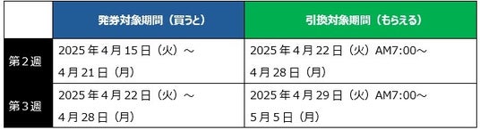 また、2025年4月8日(火)から4月14日(月)の第1週発券期間中に対象商品をご購入された方は、4月15日(火)AM7:00から対象商品の引き換えが開始します。
