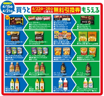 2025年4月8日(火)から4月14日(月)の第1週発券期間中に対象商品をご購入された方は、4月15日(火)朝7:00から対象商品の引き換えが可能になります。引換対象期間内に、レシートに印字された「無料引換券」と引換対象商品をお持ちいただき、レジにて商品をお引き換えください。