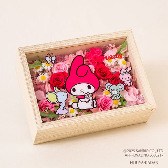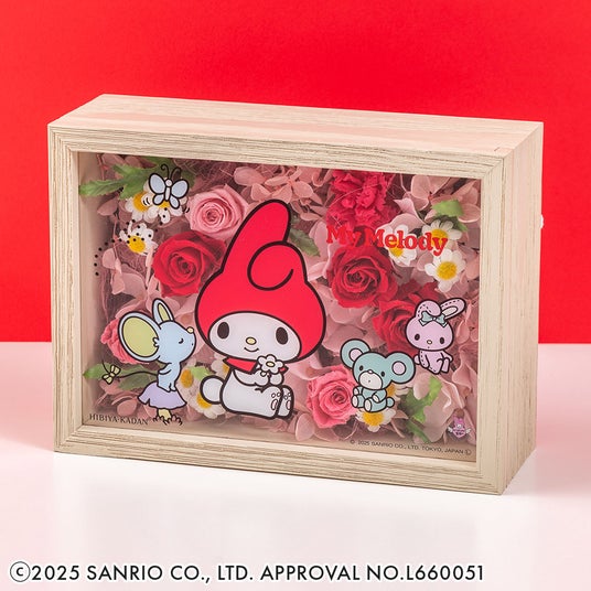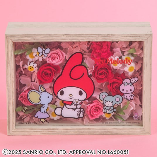 マイメロディとおともだちのアートがとてもかわいらしいフレームアート。お花がぎゅっとつまった日比谷花壇ならではのデザインです。生花ではないのでお水やりは必要ございません。