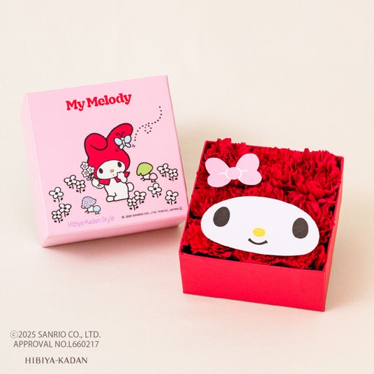 箱を開けるとマイメロディの愛されフェイスが現れる!マイメロディ50周年を記念した限定フラワーギフトを全国の日比谷花壇店舗・オンラインショップで販売開始。