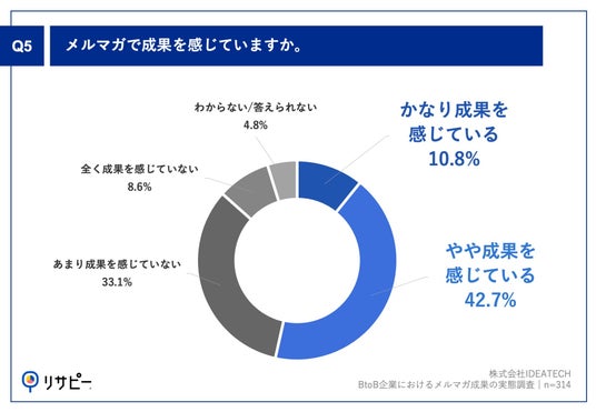 「Q5.メルマガで成果を感じていますか。」(n=314)と質問したところ、「かなり成果を感じている」が10.8%、「やや成果を感じている」が42.7%という回答となりました。
