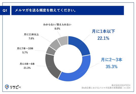 「Q1.メルマガを送る頻度を教えてください。」(n=314)と質問したところ、「月に2本~3本」が35.3%、「月に1本以下」が22.1%という回答となりました。