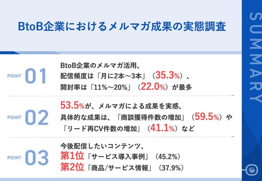 まず、BtoB企業のメルマガ活用状況としては、配信頻度は「月に2本~3本」(35.3%)、開封率は「11%~20%」(22.0%)が最多となりました。また、53.5%が、メルマガによる成果を実感しており、具体的な成果では、「商談獲得件数の増加」(59.5%)や「リード再CV件数の増加」(41.1%)などが挙げられています。さらに、約半数が、メルマガで成果を得るため、「コンテンツの質の改善」に注力しており、今後配信したいコンテンツに関しては、第1位「サービス導入事例」(45.2%)、第2位「商品/サービス情報」(37.9%)の結果となりました。