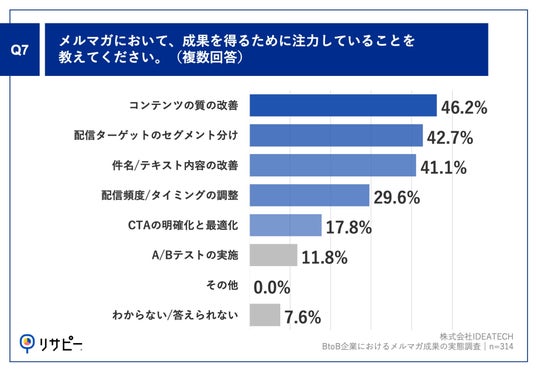 「Q7.メルマガにおいて、成果を得るために注力していることを教えてください。(複数回答)」(n=314)と質問したところ、「コンテンツの質の改善」が46.2%、「配信ターゲットのセグメント分け」が42.7%、「件名/テキスト内容の改善」が41.1%という回答となりました。