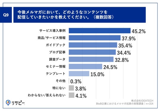 「Q9.今後メルマガにおいて、どのようなコンテンツを配信していきたいかを教えてください。(複数回答)」(n=314)と質問したところ、「サービス導入事例」が45.2%、「商品/サービス情報」が37.9%、「ガイドブック」が35.4%という回答となりました。